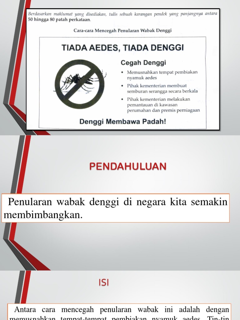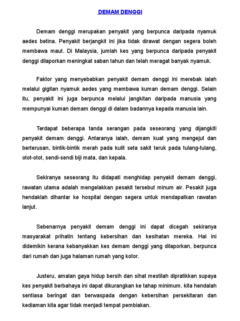 C Mereka yang disyaki menghidap demam denggi berdarah boleh mendapat rawatan di klinik. Semoga perkongsian bahan-bahan rujukan panduan bahan pembelajaran dan pengajaran contoh-contoh karangan sumber rujukan PT3 Pentaksiran. Huraikan pendapat anda tentang langkah-langkah yang dapat kita ambil untuk mencegah deman denggi.