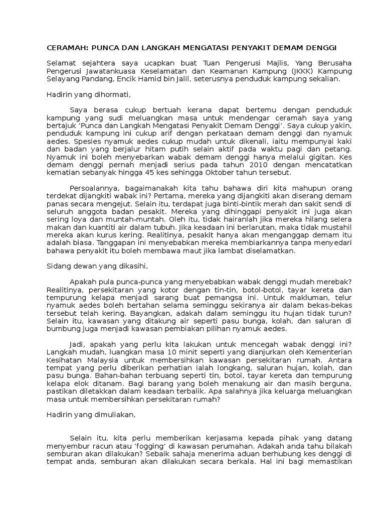 Terima kasih Tuan Pengerusi MajlisAssalamualaikum dan salam sejahtera diucapkan kepada Yang. Setiap lapisan masyarakat sayugia bersepadu dan bersifat rasional terhadap kebersihan agar pembiakan nyamuk aedes dan penularan penyakit demam denggi akan terencat. Karangan respons terbuka 30 markah instrumen contoh karangan karangan contoh 1.